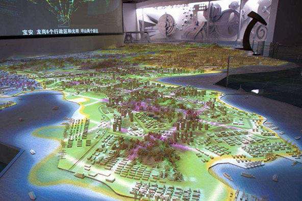 全息互動投影沙盤在傳統電子沙盤的基礎上,將沙盤放置在定制的全息成像展示柜中,通過計算機多媒體控制技術,控制聲音、視頻等同步顯示,既可通過遙控、手控、感應式控制,也可以通過多媒體控制;既可數碼顯示、單點顯示、組合顯示、動態顯示等。